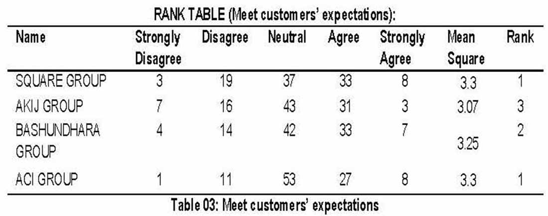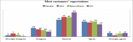 The figure (03) above shows the response about meeting the expectation of the customers. It shows 8 percent of customers each strongly agreed that Square group and ACI meet the customers’ expectations. On the other hand, 33 percent each agreed that Square and Basundhara group meet customers’ expectation while 31 percent agreed for AKIJ and 27 percent agreed for ACI. There was 19 percent of customers who disagreed about meeting expectations of customers of Square group while 16 percent for AKIJ and 11 percent each for ACI and 14 percent for Basundhara. It also shows a major portion of the respondents opined neutral in this issue.