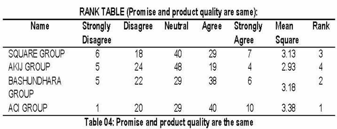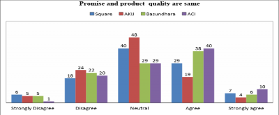 All the companies promise something better while promoting their products. The figure (04) above shows 40 percent of the respondents agreed while 10 percent strongly agreed the promise and products of ACI are the same while 38 percent agreed about Basundhara, 29 percent for Square and 19 percent for AKIJ. On the other hand, a big portion was neutral regarding the issue. It shows 24 percent customers disagreed that AKIJ group’s promise and product quality are same, 20 percent disagreed about Basundhara, and 20 percent disagreed about ACI and 18 percent about Square group.