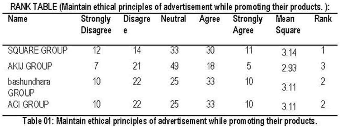 According to the rank table above, it is found that Square Group ranked first while Bashaundhara Group and ACI Group ranked second jointly in terms of maintaining the ethical principle of advertising.