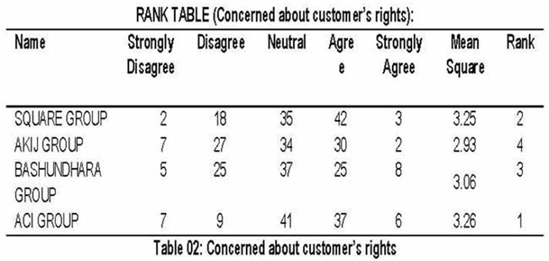 The table shows the ACI group ranked first about considering the rights of the consumer. Square Group ranked second on this point.