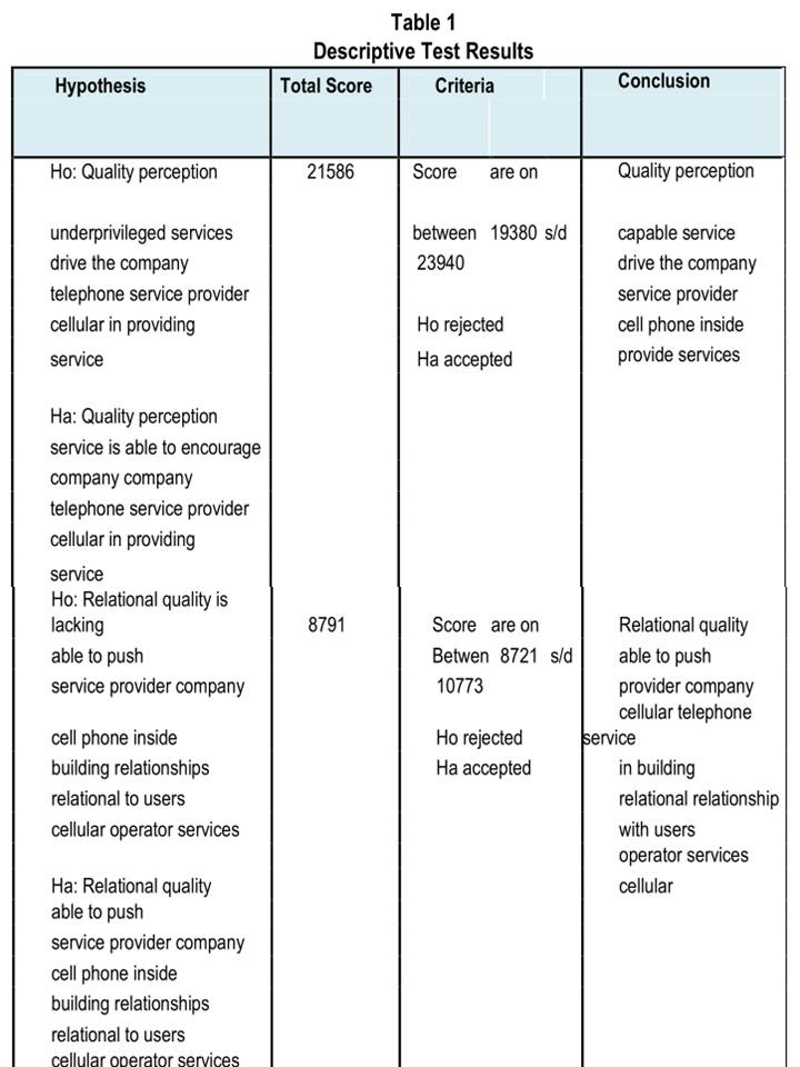 Overall analysis of service quality perception and relational quality in increasing customer satisfaction and loyalty to cellular telephone service providers can be tested descriptively as follows in table 1: