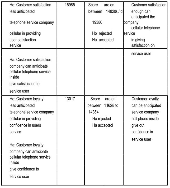 Customer satisfaction of cellular operator service users must be increased by cellular service provider companies, especially customer satisfaction which includes elements such as calculation of the cost of SMS between operators currently used and other operators, honesty in setting tariffs carried out by cellular operators used when this, the payment process (use of pulses) the use of cellular telephone operators currently used, handling customer complaints from cellular operators currently in use, customer service assistance from cellular operators in use today, the suitability of advertisements with services provided from cellular operators, services cellular operators are used today because they are in line with expectations, cellular operator SMS services are used today because they are in line with expectations.