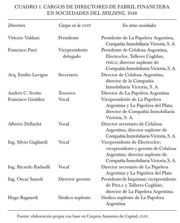 En suma, en el directorio de Fabril Financiera se incorporaron pocos representantes de las empresas controladas. En contraste, la expansión y el control accionario por parte de Fabril Financiera de firmas líderes de la época proporcionaron lugares destacados a sus directivos en las empresas que conforman el holding (véase cuadro 1).12