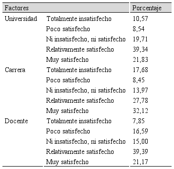 La complacencia estudiantil con la universidad, presenta principalmente una relativa satisfacción (39,34%), seguido de un 21,83% muy satisfecho. Con respecto a la Carrera, los resultados muestran una alta satisfacción (32,12%), seguido de un 27,78% relativamente satisfecho. Además, en lo que concierne al personal docente, se posiciona primero un 39,39% de satisfacción relativa, continuando con un 21,17% de alta satisfacción. En los tres casos se observa que la satisfacción relativa y alta alcanza un promedio de 60%, ver en Tabla 9.