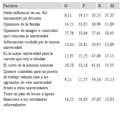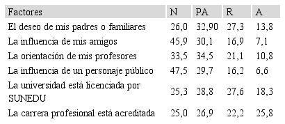 Sobre el punto anterior cabe resaltar la diferencia entre los factores que influyen en la elección de la universidad y la carrera. En el primer caso, la elección del centro de estudios corresponde mayormente a una decisión propia, referida a la calidad académica del programa escogido y a una mayor posibilidad a futuro de insertarse exitosamente en el campo laboral. Empero, la elección de la carrera, es decir “qué estudiar”, se orienta a una influencia directa por parte del entorno familiar cercano y al aseguramiento de la calidad educativa que se recibirá durante los estudios: Licenciamiento institucional y acreditación reconocida del programa formativo.