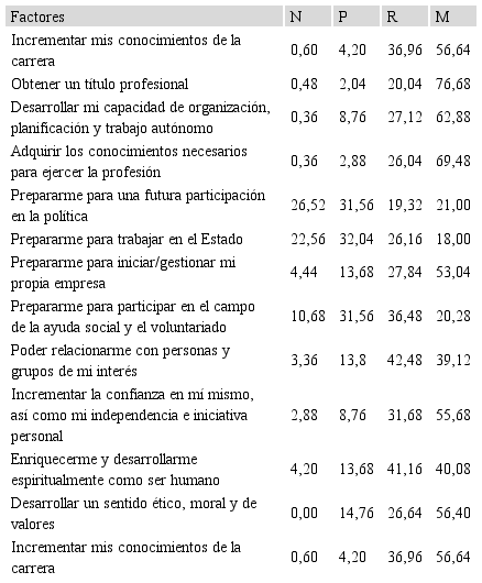 Al revisar los datos relacionados a los objetivos planteados por el estudiante universitario durante el primer semestre de estudios, como se muestra en la Tabla 6, El clúster 1 (Mucho), destaca una alta importancia en la obtención del título profesional (76,68), la adquisición de conocimientos necesarios para ejercer la profesión (69,48) y el desarrollo de capacidades de organización, planificación y trabajo autónomo (62,88). En el clúster 2, denominado Regular, se halló que existe una importancia media-baja a poder relacionarse con personas y grupos de interés personal (42,48) y también al factor denominado enriquecer y desarrollarse espiritualmente como ser humano (41,16). El clúster 3 (Poco), evidencia una baja significación a prepararse para una futura participación en el campo de la política (31,56), trabajar para entidades estatales (32,04) y participar en responsabilidad social (36,48). Por último, el clúster 4, designado Nada, se caracteriza por mostrar una muy baja importancia a participar en el futuro dentro de la política (26,52) y como trabajador para el Estado (22,56).