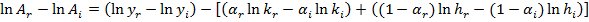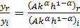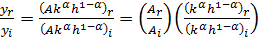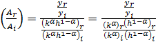 En la ecuación (1) y representa el producto (real) por trabajador, es decir, el total de la producción de bienes y servicios de uso final dividido entre el número de trabajadores ocupados en la economía; k es el stock de capital físico disponible por trabajador; es un índice de capital humano por trabajador; h mientras que y son parámetros que recogen las participaciones de la remuneración del capital y del trabajo dentro del ingreso nacional, respectivamente; finalmente, A es la medida de la eficiencia o productividad total con la que se emplean los factores. El cociente entre el producto por trabajador del país rico respecto al i-ésimo país, es dado por la siguiente expresión: