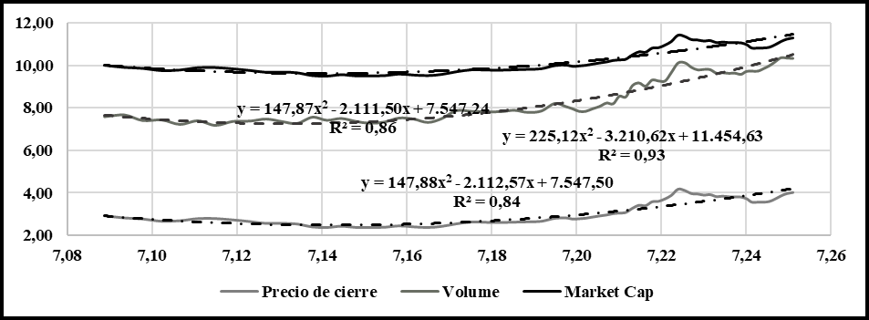 En el Gráfico I, se puede destacar la evolución ascendente de cada una de las variables, teniendo como hecho relevante que los coeficientes de las ecuaciones de regresión tanto en el precio de cierre, como capitalización del mercado, son similares; lo cual evidencia un alto grado de asociación como se muestra en la Tabla 1. Asimismo, se puede notar que en la medida que aumenta la cantidad de criptomonedas emitidas, se incrementa el valor de cada una de las variables dependientes en mayor cuantía, cuyos coeficientes de elasticidad son 16,45 respecto al precio de cierre, 15,98 en el volumen de las transacciones y 5,51 con la capitalización del mercado; evidenciándose un componente de elasticidad total, donde una variación del 1% en las criptomonedas emitidas, se traduce en una variación del 16,45% del precio de cierre; 15,98% del volumen de las transacciones y 5,51% en la capitalización del mercado.