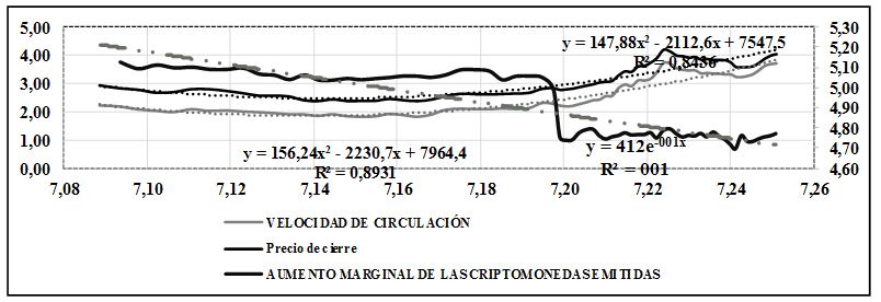 Se estimó y modelo mediante el empleo de funciones de regresión polinomial y lineal del aumento marginal de las criptomonedas emitidas y las criptomonedas emitidas calculadas como el cociente entre la capitalización del mercado y el precio de cierre. Seguidamente, se valuó y simuló el crecimiento del precio de las criptomonedas respecto a volumen de transacciones, demostrando cómo la emisión de criptomonedas evoluciona en forma contraria al resto de las variables del mercado, todo en aras de revalorizar el precio de los Bitcoins por las razones de la oferta y la demanda, debido a que crece el volumen de transacciones (demanda) y disminuye progresivamente la tasa de crecimiento del aumento marginal de Bitcoin.
