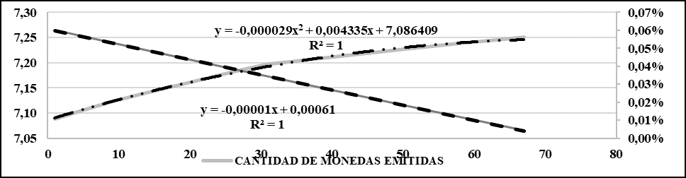 En lo que respecta al Gráfico II, este explica cómo ha funcionado el mercado de las criptomonedas, el cual consiste en un aumento de las criptomonedas emitidas, como consecuencia del incremento del volumen de transacciones, esto a su vez provoca un acrecentamiento de los precios y la velocidad de circulación; pero de forma contraria, se produce una disminución marginal exponencial del -62% respecto a las criptomonedas emitidas el mes anterior, razón por la cual se eleva cada vez más su precio en forma tendencial.