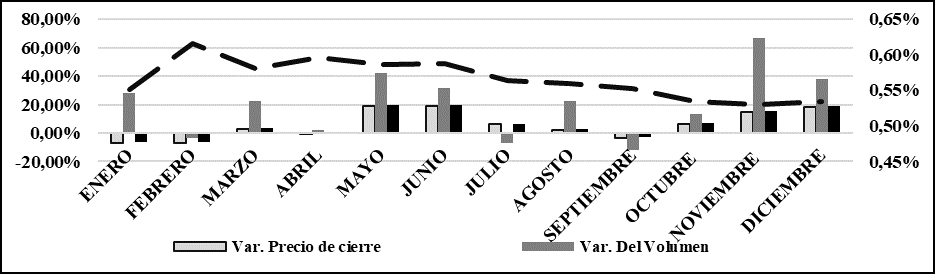 Es decir la tasa de crecimiento del precio respecto al volumen de transacciones es 16% según lo mostrado en el Gráfico IV, pero presentando un componente de inelasticidad, es decir, una variación de 1% del volumen de las transacciones se traduce en una variación del 0,86% de los precios. Asimismo, la tasa de crecimiento del volumen respecto al tiempo es para el periodo analizado