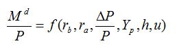 Así, según Salerno (2010), la demanda de dinero quedaría determinada: 1) Por los costos de los servicios productivos del dinero; 2) la tasa de rendimiento del dinero y otros activos; 3) por el tamaño del volumen de ventas, producción total de las empresas; y 4) por factores tales como las expectativas. De esta manera, de acuerdo con Friedman (1956), la demanda de los saldos monetarios en término reales es una función que depende de forma inversa del rendimiento (ra y rb) de otros activos financieros alternativos (bonos y acciones) y de la tasa esperada de cambio de precios