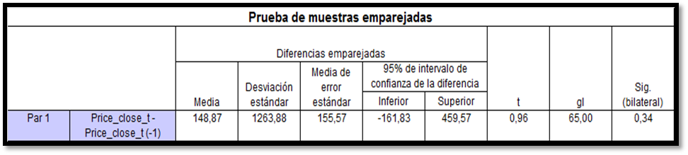 Lo anteriormente expuesto coincide con lo planteado por Mises (1982) en relación a su “teorema de la regresión”. Así, el valor del Bitcoin (precio cierre promedio) en el mes M, es igual al poder adquisitivo del mes anterior M-1, tal como se muestra en la Tabla 2, donde el valor de la media es positivo y se encuentra dentro de los intervalos de confianza de la diferencia al 95%, es decir el precio de cierre presente es mayor al precio de cierre del mes anterior en términos promedios, aunque dicha diferencia no sea significativa debido a que el Sig. (Bilateral)>0,05; ello pudiera explicarse a la buena coordinación del mercado en sus variables.