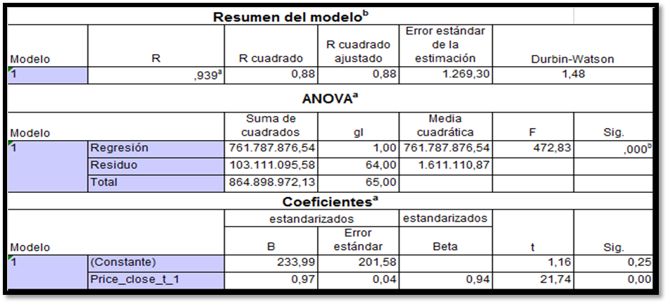 En la Tabla 3, se observa que existe un alto grado de asociación lineal de 0,94 es decir 94% mientras que el mismo explica el 88% de la variable dependiente precio de cierre en el mes actual PCt; la misma presenta un incremento constante mensual de 233,99 dólares, más el 97% del valor del precio de cierre mensual anterior, los residuos del modelo son completamente independientes puesto que el estadístico Durbin-Watson está ubicado en los límites dL=1,43 y dU=1,49 con un nivel de significancia del 1% con un intervalo de confianza del 99%. El modelo es significativo para la predicción, debido a que el valor de Fcalculado= 472,83, como el de Tcalculado= 21,74 son significativos por ser mayores a sus valores teóricos Fteórico= 7,077 Tteórico= 7,05.