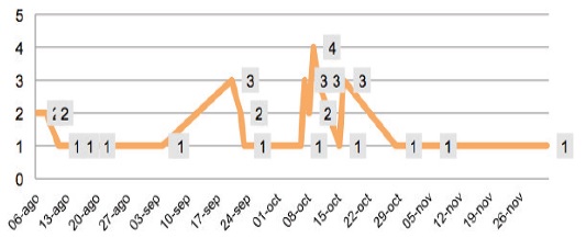 En este sentido, es aconsejable realizar un análisis exhaustivo de la comunicación de las administraciones públicas a través de las redes sociales en los casos de crisis para poder establecer el perfil que éstas adoptarán. Un buen ejemplo es la emisión de mensajes desde el perfil creado para la comunicación digital del caso del Ébola, que no sólo permite visualizar la dinámica informativa en las fases de eclosión, perversión y síntesis de la crisis sino que anticipa que estas crisis sanitarias podrían adoptar un clásico perfil de crisis de tipo cíclico, como muestra el Gráfico 7, correspondiente a las informaciones publicadas desde la cuenta institucional @sanidadgob.