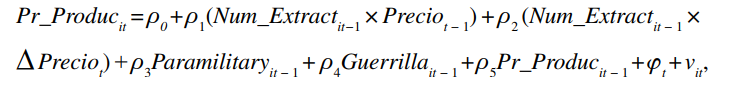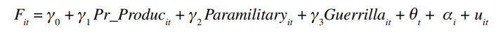 (1)for i = 1,.., 30; t = 2000,.., 2010 where Fit is the rate of forced displacement by expulsion for every 10,000 inhabitants in municipality i in year t; Pr_Producitis the percentage of area used in the production of palm oil in municipality i in year t; Paramilitaryit assumes a value of one if actions of political violence are attributably reported to paramilitary groups in municipality i in year t; Guerrillaittakes value one if actions of political violence are attributably reported to guerrilla groups in municipality i in year t; θt denotes time effects while αi denotes municipality fixed effects that capture time constant characteristics related to the type of land across municipalities; and finally, uit is the idiosyncratic errors of municipality i in year t.