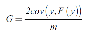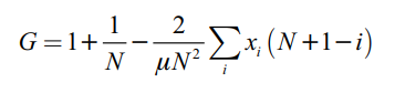 (2)Se consideró el coeficiente de Gini como indicador perteneciente a la familia de indicadores derivados de la curva de Lorenz —como se indicó antes—, ya que cumple con las propiedades deseables básicas de los indicadores de la desigualdad. Gráficamente, es la proporción entre el área de la curva de Lorenz y la línea de perfecta igualdad, sobre el área entre la línea de perfecta igualdad y la línea de perfecta desigualdad. De acuerdo con Lambert (2002), la estimación en el caso discreto (con microdatos) del coeficiente de Gini se realiza como se indica en la ecuación (3), donde i es la posición en la distribución de ese individuo cuando se ordena la distribución ascendentemente por el ingreso, el resto de componentes son los mismos que en (2).