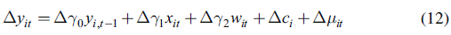 Donde, yit es el logaritmo natural de los homicidios del departamento i en el año t; xt es un vector de variables exógenas, y wt es un vector de variables predeterminadas o endógenas, en este caso específicamente el logaritmo natural del PIB. Para Arellano y Bover (1995), los errores idiosincráticos μΗ están correlacionados con y¡ t -j, y para evitar esta correlación, se debe estimar también el modelo en primeras diferencias de la siguiente forma: