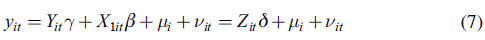 Donde, yit es el logaritmo de los homicidios departamentales (i);Yt es un vector de observaciones de 1 χ g2, con g2 variables endógenas incluidas como variables explicativas; X,es un vector de observaciones de 1 χ k,, con k, variables exógenas; Zit= [YitXit ], con Xit= [XlitX2it ],donde X2it es un vector de 1 χ k2 , con k2 variables instrumentales; γ es un vector de coeficientes de g2 χ 1; β es un vector de coeficientes de k1 χ 1, y δ es un vector de coeficientes de K χ 1 donde K=g2 + k1. μ1. es el componente de efectos fijos, y vit es el error idiosincrático.