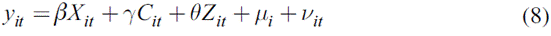 Donde, yit es el logaritmo natural del número de homicidios del departamento i en el periodo t; Xit es el logaritmo natural del PIB real del departamento i en el periodo t; Cit es el vector de controles; Zit es el logaritmo del PIB real latinoamericano; μi es el componente de efectos fijos, por medio del cual se tiene en cuenta la heterogeneidad no observable de los departamentos, y vit es el componente aleatorio, también conocido como término de error idiosincrático.