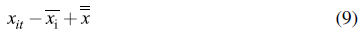 La tabla 2 reporta las estadísticas descriptivas del panel de datos en niveles y en logaritmos, entre las que se muestran, además de las medidas convencionales (media, desviación estándar, mínimo y máximo), la dispersión de la media entre grupos % (between) e intragrupos (within) con respecto a la media global 3c. Donde la media intragrupos se calcula como: