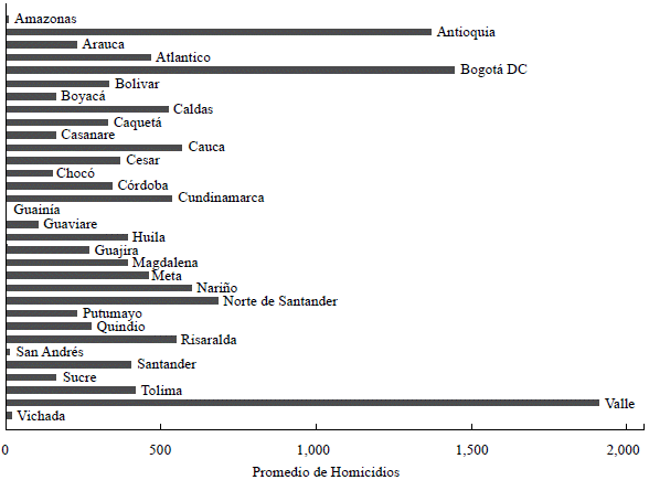 En el gráfico 1 se puede observar el promedio de homicidios entre 2001 y 2017 para cada departamento, incluido el distrito capital, que con el Valle del Cauca, Antioquia y Norte de Santander presentan los valores medios más altos. En particular, se puede resaltar que en los primeros años del siglo XXI es el Valle del Cauca el departamento que mayor promedio de homicidios presenta con 1920, lo que representa algo más de cinco homicidios diarios. En general, el gráfico muestra que las regiones colombianas sufren una violencia homicida generalizada con pequeñas excepciones.