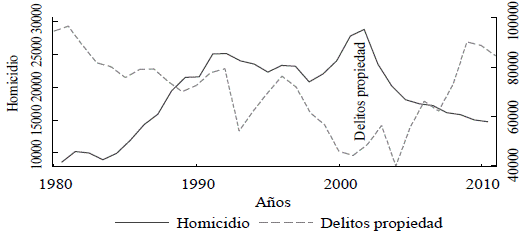 Esta relación inversa entre la variación de los homicidios y otros delitos, al parecer, podría ser explicada por la actividad económica del país. Es decir que, en momentos de auge económico, los delincuentes tienen mayores probabilidades de cometer delitos contra la propiedad e incurrir en otras actividades criminales menores, mientras que, en periodos de desaceleración económica es difícil cometer este tipo de delitos menores; ante lo cual, los delincuentes se ven obligados a usar más violencia y, por tanto, se produce un aumento en los homicidios. En consecuencia, se podría afirmar que uno de los mecanismos que dispara o contiene la actividad criminal es la prosperidad de la actividad económica.