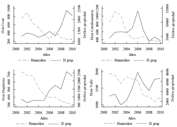 El gráfico 3 muestra que, por ejemplo, para el departamento del Cesar entre 2004 y 2006 mientras los homicidios disminuyen, los delitos contra el patrimonio económico aumentan. De 2007 a 2008 ocurre lo contrario, mientras los homicidios aumentan, los delitos contra la propiedad disminuyen, cambiando de nuevo ambos hasta 2010. Igualmente, para Cundinamarca, se puede apreciar que, de 2001 a 2006, los delitos contra la propiedad crecen ininterrumpidamente y los homicidios se reducen. En el caso del Magdalena, la gráfica muestra la relación inversa entre los dos tipos de delitos para toda la década. Mientras que, en el caso del Valle, de 2002 a 2010, el número de homicidios tiende a la baja y desde el 2002 hasta 2006 los delitos contra la propiedad aumentan, disminuyen hasta el 2008 y nuevamente se incrementan hasta 2010. Las regiones seleccionadas para este análisis son las que mayor fuerza visual muestran de nuestra hipótesis. Sin embargo, este es un análisis gráfico e intuitivo, pero soporta con gran validez la hipótesis de una violencia heterogénea y los hallazgos de los modelos econométricos estimados y que se presentan más adelante.