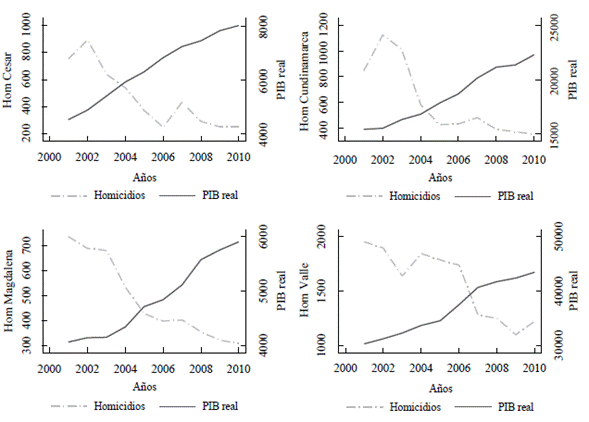 En este apartado, se analiza gráficamente cómo se relacionan los homicidios con la actividad económica a nivel departamental. Carranza et al. (2011), a partir de estudios con medidas del total nacional, determinan que los homicidios y la actividad económica en Colombia se relacionan de forma inversa. A nivel departamental, también parece confirmarse el efecto negativo de la actividad económica sobre los homicidios, tal y como se puede ver en el gráfico 4. Por ejemplo, para los departamentos del Cesar, Cundinamarca, Magdalena y Valle, la gráfica revela cómo mientras la actividad económica departamental va creciendo, el número de homicidios disminuye. A partir de estas observaciones surgen dos hipótesis: la primera es que los homicidios y los delitos contra la propiedad presentan una relación inversa en el orden departamental; y segundo, que la actividad económica se correlaciona negativamente con los homicidios.
