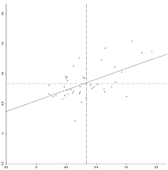En términos de la relación entre los homicidios y el agregado de los delitos contra el patrimonio económico, cabe resaltar que en 18 departamentos la relación es negativa, lo cual señala que, en más de la mitad de los departamentos del país, se confirma la relación inversa entre la violencia homicida y los delitos contra la propiedad. Lo anterior, concuerda con nuestra hipótesis de una violencia heterogénea que no se puede agregar por un sesgo de agregación en delitos, crimen o violencia total. De acuerdo con los anteriores resultados, la relación inversa que se da entre los homicidios y los delitos contra la propiedad, tomando en cuenta las medidas del total nacional, se da también en el caso de los departamentos. Esto implica que, cuando este tipo de delitos aumenta, el número de homicidios baja y viceversa.