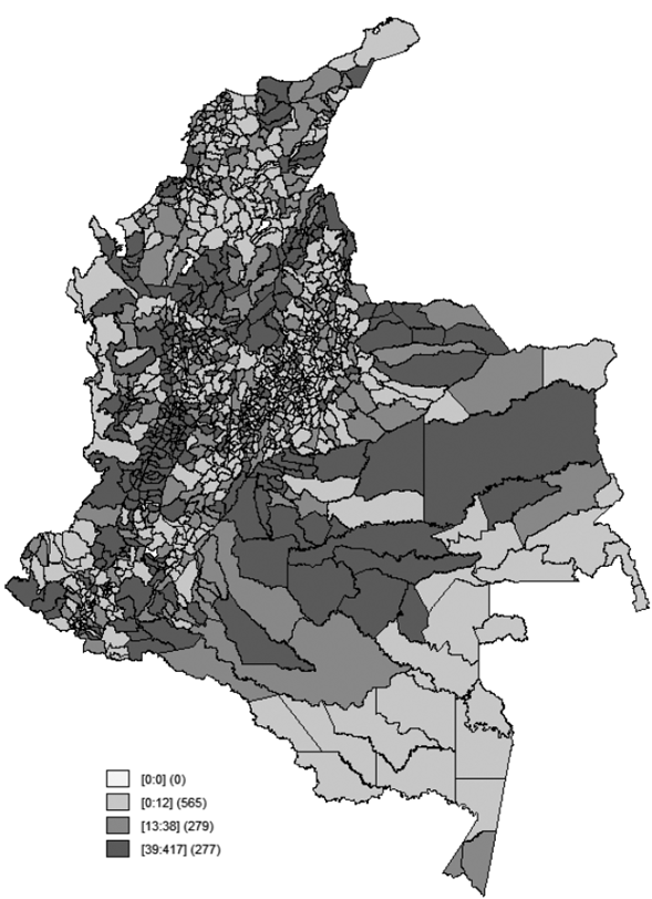 En esta sección se utilizan las herramientas de análisis espacial básico con el objetivo de observar la existencia de patrones espaciales de comportamiento en los homicidios por departamentos (y municipios). Asimismo, con el fin de mostrar por qué los departamentos son la unidad geográfica de estudio, se siguen las propuestas de análisis espacial de Krugman, Masahisa y Venables (2000), Anselin y Florax (2012) y Elhorst (2014), quienes destacan que esta metodología permite explorar los patrones más importantes que se encuentran en un grupo de datos geo-referenciados. Empezamos con el Índice de Moran1 para estimar la potencial existencia de una correlación espacial. La hipótesis nula por evaluar es la no autocorrelación espacial de los datos. Así, para analizar la distribución espacial de los homicidios se utilizan el mapa 1, el gráfico 5 y la tabla 1. En el mapa 1, los colores claros indican los municipios con bajas tasas de homicidios; mientras que los municipios con los colores más oscuros muestran mayores tasas. Así pues, es posible observar una fuerte relación en los homicidios por municipios, casi en forma de clusters, y menos fuerte entre los 32 departamentos de Colombia.