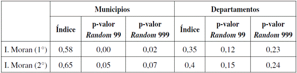 Del mismo modo, el gráfico 5 presenta el diagrama de dispersión asociado al estadístico índice de Moran. En el eje horizontal del diagrama se tienen las observaciones de la variable en unidades de desviaciones respecto a la media y en el eje vertical se tiene el promedio ponderado espacial y estandarizado de sus vecinos. La pendiente de la línea de regresión corresponde al coeficiente del índice de Moran y la significancia se simula por medio de técnicas de bootstrapping de forma aleatoria con 99 y 999 repeticiones. En la tabla 1 se muestran los valores del índice y del pseudo p-valor asociado a la significancia estadística.