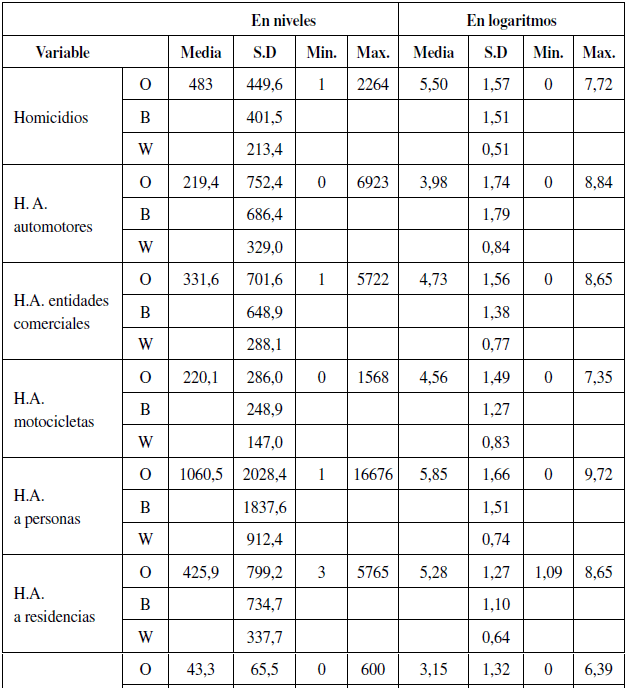 En el caso de las variables en niveles, el promedio de homicidios es de 484 muertes y la desviación estándar es de casi 450, mientras que el máximo de homicidios cometidos es de 2264, cifra que corresponde a la ciudad de Bogotá D.C., en el período entre los años 2001 y 2010. Respecto a los delitos contra el patrimonio económico, el hurto agravado a personas es el que presenta la media más alta con 1060 víctimas, seguido por el hurto agravado a residencias con casi 426, el hurto a entidades comerciales con 331,6 y el hurto de automotores con 219,4.