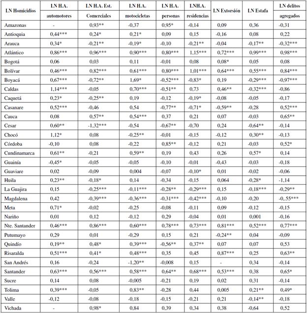 Donde, Ln(Homt ) es el logaritmo natural del número de homicidios del departamento en el momento t; Ln( Xt ) es el logaritmo natural de cada tipo de delito contra el patrimonio económico del departamento en el momento t y st es el término de error. Esta especificación del modelo permite comprender mejor la correlación entre los diferentes tipos de delitos frente a los homicidios. Al analizar por cada tipo de delito, se puede observar que el mayor número de relaciones negativas se da para el hurto agravado a personas, con 18 casos; hurto a entidades comerciales, con 16 casos; hurto a residencias, con 16 casos; estafa, con 16 casos, y hurto de motocicletas, con 14 casos. Un número de casos menor, pero relevante, se da con la extorsión y el hurto agravado de automotores.