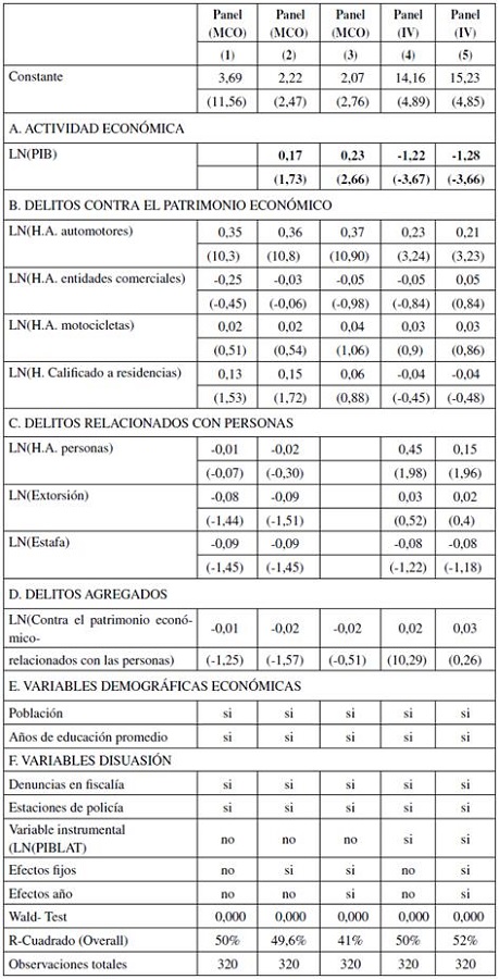 A partir de la tabla 4 se pueden observar los resultados de las estimaciones del modelo de datos de panel. Las primeras tres especificaciones corresponden al método de mínimos cuadrados ordinarios (MCO). En este orden, el primer modelo muestra cómo, sin incluir la actividad económica, ni efectos fijos, el único delito contra el patrimonio económico que resulta tener una relación inversa con los homicidios corresponde a los hurtos a entidades comerciales, un delito a la propiedad. Por el contrario, el hurto a automotores, el hurto a entidades financieras y el hurto calificado a residencias tienen signo positivo. Con respecto a los delitos relacionados con las personas, a saber, el hurto agravado a personas, la extorsión y la estafa, todos presentan signo negativo, pero no son estadísticamente significativos.