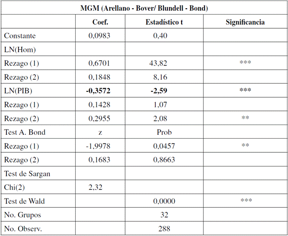 Por lo tanto, es importante resaltar el resultado en el cual la actividad económica tiene un efecto negativo y significativo sobre los homicidios cuando se corrige el problema de endogeneidad de la actividad económica por el método de variables instrumentales. Para profundizar en esta cuestión, cabe emplear otro tipo de metodologías de estimación basadas en el Método Generalizado de Momentos (GMM). Según Arellano y Bond (1991), esta metodología permite la estimación de un panel dinámico para el cual se utilizan variables instrumentales basadas en los rezagos y las diferencias de todas las variables del modelo. Así, las posibles variables instrumentales y sus rezagos se obtienen del método desarrollado por Hansen (1982). Según Cameron y Trivedi (2005) y Wooldridge (2010), la especificación del modelo sería: