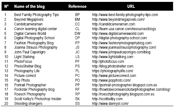 The data were obtain from the analysis of a corpus of photography blogs, gathered by means of an Internet search. The details of the corpus composition in terms of the name, the number of texts and the number of words from each blog are summarized in Table 1. Our sources have been twenty blogs on the subject (see Appendix 1), dated between 2007 and 2014. They were selected following three criteria: first, they had to be written in English by native speakers, second, they had to be written by both men and women, and third, blogs were selected that contained as much text as possible7. Once the blogs were identified, their contents were manually downloaded into text files. Each blog and each post has been tagged with its own reference, which will be used throughout this paper, so as to provide the source of the items. The taggers consist of the initials of the blog and the date of a publication of the post on the Internet. For instance the reference BM_090710 means that the item has been extracted from the blog called “Beyond Megapixels” from the post published on July 10th 2009. However, posts such as “Digital Photography School” or “Picture correct”do not have the exact date of publication and in these cases we use their initials with the name of the post, as in “PC_Contrast_in_Photography”.