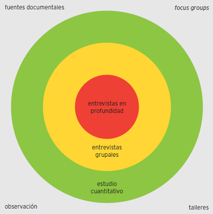 De manera coincidente con el enfoque predominante en la literatura, la construcción de un diseño metodológico que combine el empleo de distintas estrategias cualitativas que le permitan al observador2 adentrarse lo más posible en la realidad organizacional (Tierney, 2008) se considera la perspectiva más apropiada para el estudio de la identidad, la cultura y la imagen organizacional de una universidad. No obstante, la utilización de técnicas cuantitativas puede resultar útil en aquellos casos en los que se desee relevar información sintética o identificar tendencias en el comportamiento de ciertas variables. La adopción de un enfoque clínico y etnográfico (Schein, 2010) le permitirá al observador comprender e interpretar el significado de los artefactos e ir rastreando poco a poco los elementos más tácitos y subyacentes del sistema cultural y de significado de la organización.