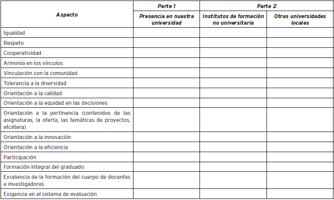 P5. A continuación se le presenta una tabla compuesta por dos (2) partes. En la parte 1, se le solicita que califique una lista de aspectos en función de cuan presente Usted cree que se encuentra cada uno en nuestra universidad, asignando un número del 1 (nada presente) al 5 (totalmente presente). En la parte 2, se le pide que compare cada aspecto de la lista con otras instituciones en función de su grado de similitud, asignando un puntaje del 1 (en este aspecto la universidad y la institución comparada son totalmente distintos) al 5 (en este aspecto la universidad y la institución comparada son totalmente iguales). En caso de no desear responder, puede dejar la celda de la tabla vacía.