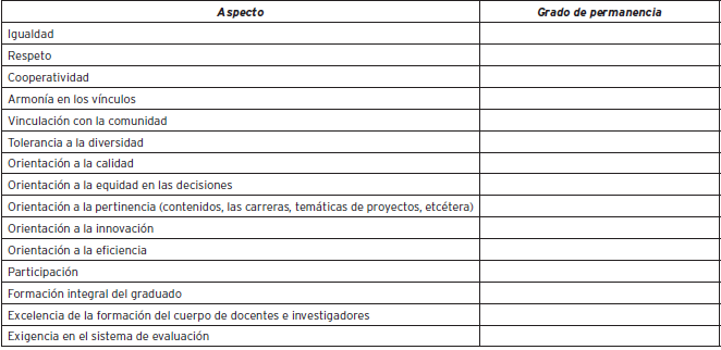 En términos de Schein (2010), detrás de los artefactos (y los símbolos) subyacen un conjunto de valores y presunciones que guían el comportamiento de los individuos dentro de la organización. Primeramente, y para motivar una emergencia espontánea de los mismos, se le podría solicitar al encuestado que enuncie hasta cinco valores que considera que tienen influencia en la toma de decisiones de la organización (ítem P4). Aquí se analizará fundamentalmente la saliencia (es decir, la frecuencia de evocación, cantidad de veces que el atributo es mencionado por los encuestados) y la centralidad (lugar que ocupa el atributo en la mente del sujeto: primera mención, segunda mención, tercera mención, etcétera). Acto seguido, se le podría entregar al participante un listado de atributos y solicitarle que indique, desde su percepción, el grado de presencia de cada uno de ellos en la universidad bajo análisis (ítem P5). Se advierte que es probable que, si existieran intentos frecuentes de la Dirección de reforzar valores organizacionalmente deseables, la respuesta de los encuestados se encuentre más alineada con dichas influencias.