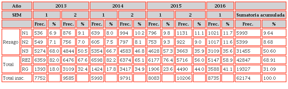 La Tabla 1 muestra la frecuencia por periodo de ingreso y nivel de rezago. Destaca mayor frecuencia de casos por rezago en los periodos semestrales 1 (ingreso enero-junio) en comparación con los periodos semestrales 2 (ingreso agosto-diciembre). Asimismo, el N3 de rezago predomina en todas las cohortes con una mayor cantidad de casos en comparación con los niveles de rezago 1 y 2. En la última columna de la Tabla 1 se muestra la sumatoria acumulada e indica el total de estudiantes inscritos en el periodo semestral 2017-1, que comprende a 62 174 estudiantes. De estos, 42 847 se encuentran en condición de rezago por reprobación (68.91% de la población). Distribuidos por niveles: 31 455 (50.60%) estudiantes se ubican en N3, 5 399 (8.68%) en N2 y 5 993 (9.64%) en N1.