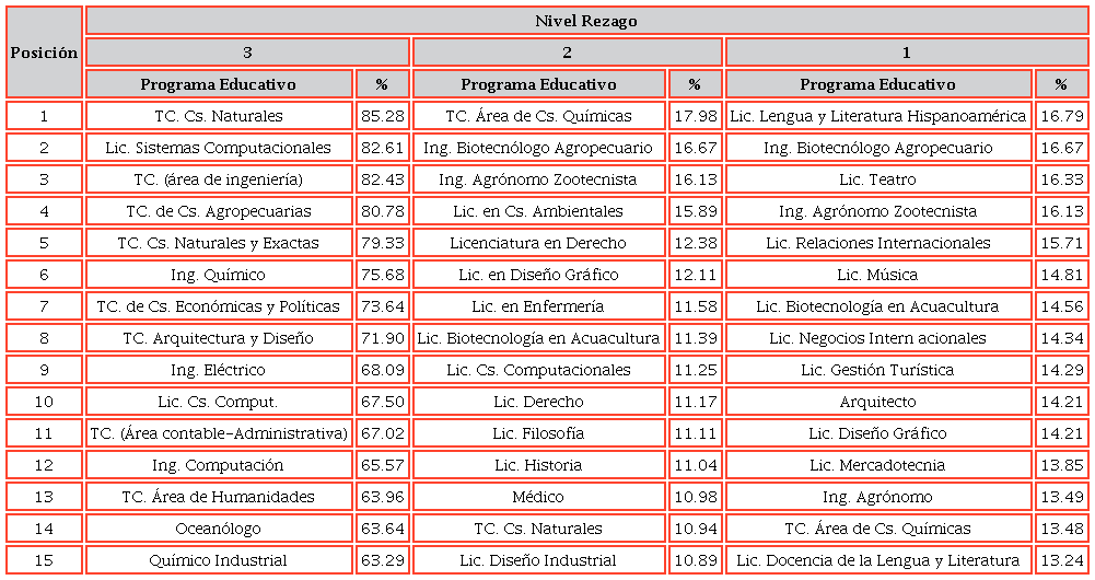 La información que se presenta atiende al orden en que se efectuaron los análisis. De esta manera, los resultados se organizaron por nivel de rezago, por programa educativo y por área de conocimiento.