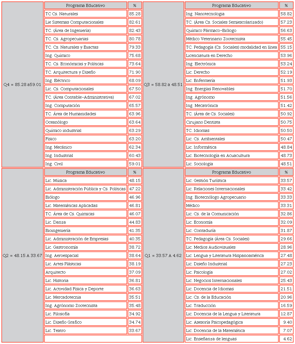 Apéndice A. Programas educativos y con mayor porcentaje de rezago N3 agrupados en cuartiles