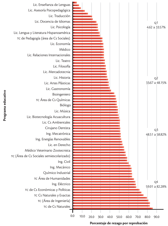 Dado que la reprobación se encontró en todos los programas, pero el mayor porcentaje se identificó en N3, los análisis se concentraron en determinar los programas con mayor proporción de rezago N3. Para organizarlos, se agruparon en cuartiles (Q). Como se muestra en la Figura 1, la mayor proporción corresponde al Q4 con valores que van de 59.01 a 85.28% de los estudiantes en condición de rezago N3, que cursan ocho troncos comunes y 11 programas educativos. El Q3 va del 48.51 a 58.82%; el Q2 de 33.67 a 48.15 %; y el Q1 de 4.62 a 33.57% (para consultar el resto de los programas ver Apéndice A). La mediana de los datos corresponde a 48.14%, lo que indica que la mitad de los programas cuentan con aproximadamente la mitad de sus estudiantes en condición de rezago.