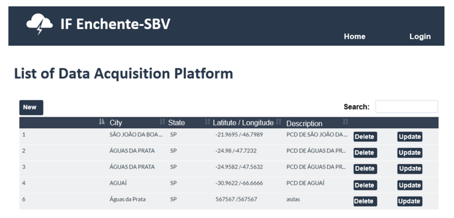 The web application of the IF-Enchentes-SBV project was developed within five Sprints, focusing on the following similar functionalities: Sprint 01 - User/Administrator Management; Sprint 02 - DAPs Management; Sprint 03 - DAPs Measurements Management; Sprint 04 - Reports and Charts Management; and Sprint 05: DAPs Critical Alerts Management.
