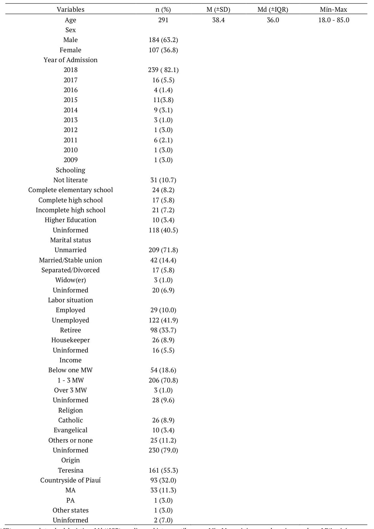 There was the analysis of 291 medical records of patients admitted during the period from February to May of 2018, which revealed the year 2018 with the highest rate of psychiatric hospitalization, 239 (82.1%). There was prevalence of men 184 (63.2%), unmarried 209 (71.8%), with a mean age of 38.4 years (with standard deviation of 12.5) and median of 36.00, ranging between 18 and 85 years. There was also a predominance of patients with low schooling, 70 (24.1%) had incomplete elementary school, 122 (41.9) were unemployed and 98 (33.7%) retired, with income up to three minimum wages 206 (70.8%), 230 (79.0%) had uninformed religion, 161 (55.3%) were from the state capital Teresina - PI) (Table 1).