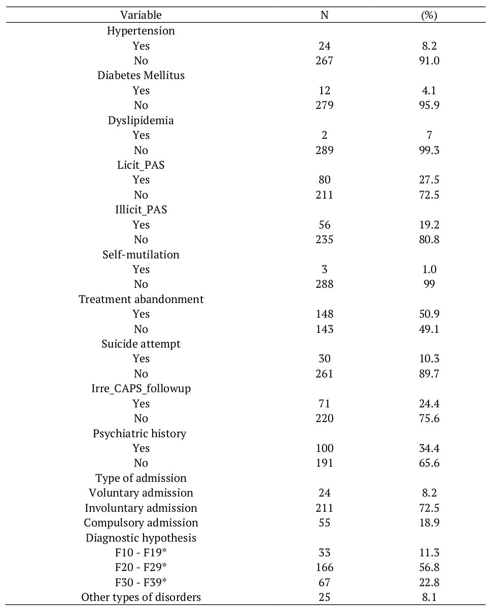 In relation to the modalities of admission, there are three known types, namely; voluntary admission, requested or consented by the patient; involuntary admission, not consented/requested by the patient, often made by third parties, mainly relatives; and compulsory admission, determined through a judicial action, requested by a physician and occurring only after the physician’s report (Brazil, 2001). In this aspect, the highest prevalence was involuntary admission, with 211 (72.5%).