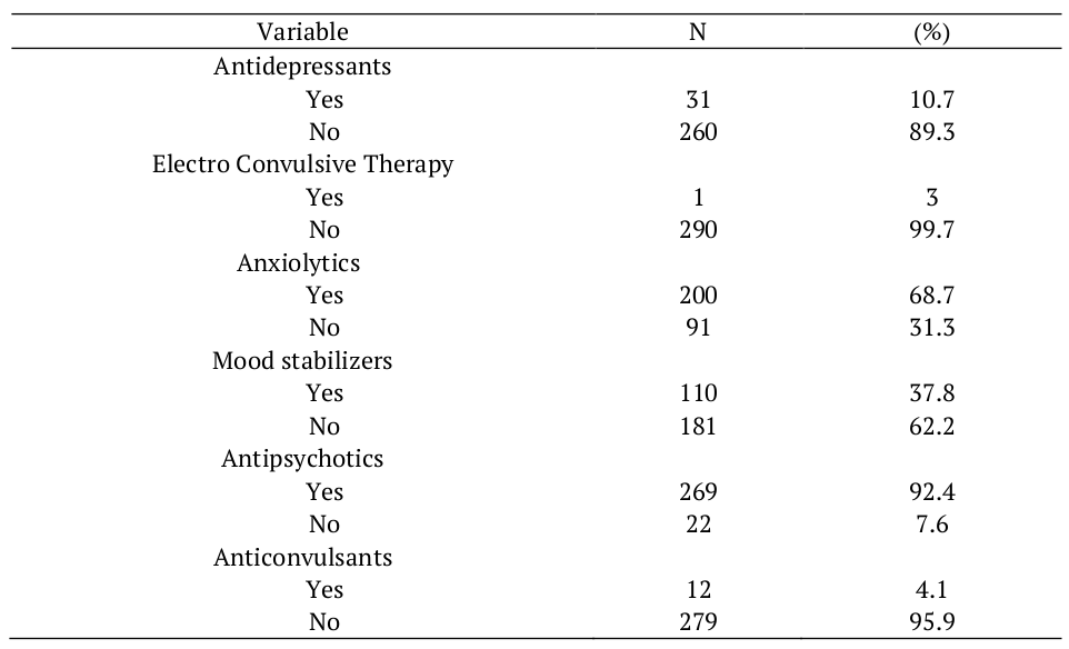 Table 3 presents the results related to the following therapeutic aspects: use of antidepressants, anxiolytics, mood stabilizers, antipsychotics, anticonvulsants and electroconvulsive therapy. Since a single patient could make use of more than one therapy concomitantly, the total could sum more than 100%.