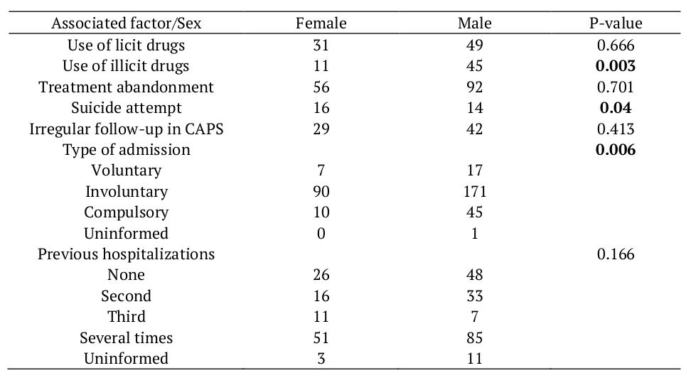 Table 4 presents the intersection between the following variables: sex and use of licit drugs, sex and use of illicit drugs, sex and treatment abandonment, sex and suicide attempt, sex and irregular follow-up in CAPS, sex and type of admission, sex and re-hospitalizations.