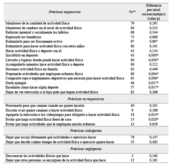 Con relación a las prácticas no responsivas , la mayor parte de los padres reportan que, en cuanto a la promoción de la actividad física no hay presión ni exceso de control, dado que si el niño no quiere caminar no lo obligan, ni tampoco discuten con él por no hacerlo. La mayoría de padres no restringen la realización de actividad física, evitando que el niño sea activo fuera de casa, ni tampoco que realice actividades que le impliquen mucho esfuerzo. En este tipo de prácticas se observan diferencias significativas en la restricción de la realización de actividad física fuera de casa y apagarle a sus hijos la televisión o los videojuegos para obligarlos a hacer actividad física, siendo más frecuente en los padres de nivel socioeconómico medio y alto (p = 0,020 y p = 0,014 respectivamente) (tabla 1).